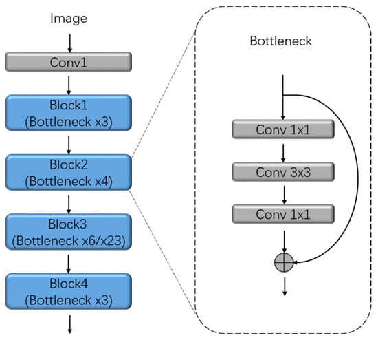The structure of ResNet50/101 which consists of one convolution layer and four Blocks. Each Block has several Bottleneck units. Inside the bottleneck unit, there is a shortcut connection between the input and output. In this study, we choose ResNet101 as the backbone of our model.