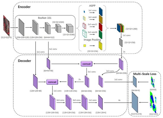 During the training phase, our model is trained by the stochastic gradient descent (SGD) algorithm [35] to minimize the overall loss. The best performance was achieved using and . As more constraints were applied, the ASPP and encoder-decoder structure fusion could be more effective. The multi-scale loss function is shown in Figure 4 and the detailed configurations of the proposed network is shown in Table 1.