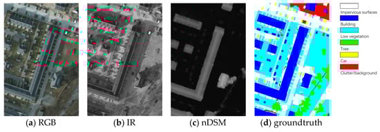 A sample of remote sensing imagery with different channels of data and the corresponding groudtruth in the Potsdam datasets.