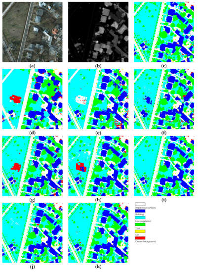 A sample of comparison prediction results of different methods on the Potsdam dataset. (a) input imagery, (b) normalized DSM, (c) corresponding ground truth, (d) result of SVL_1, (e) result of FCN, (f) result of DST_5, (g) result of RIT6, (h) result of U-net, (i) result of DeepLab_v3, (j) result of DeepLab_v3+ and (k) our model.