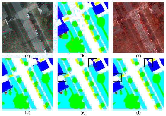 The effect of superpixel based DenseCRF. Here we show a small patch of the original imagery from the Potsdam dataset (a) input imagery, (b) groundtruth, (c) superpixel segmentation to input imagery, (d) superpixel constraint to prediction map, (e) prediction map from our model and (f) prediction map after superpixel-based DenseCRF.