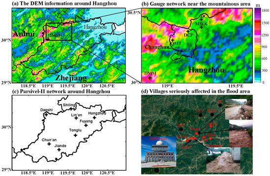 Basic information around the Da Ming Mountain (DMM) radar and Hangzhou: (a) Digital Elevation Model (DEM) information around Hangzhou; (b) gauge stations in the mountainous area; (c) the Parsivel-II network around Hangzhou; and (d) villages seriously affected during the flood event. The county lines in (a–c) indicate the border between the Anhui and Zhejiang provinces of China, Hangzhou City, and Changhua town in Zhejiang province. DCP, MWK, QMT, and DC in (b,d) indicate the validation gauge locations; the villages seriously affected by the flood are marked with red dots.