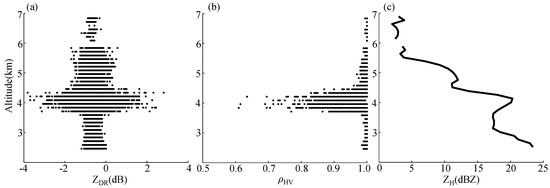 Vertical distribution of radar measurements from a “birdbath” scan at 1835 UTC, 24 April 2015: (a) ZDR; (b) ρHV; and (c) ZH.