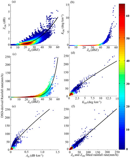 Scatter density plots of radar moments simulated by using the drop size distribution (DSD) data collected during June 2016 and 2017: (a) ZDR vs. ZH; (b) KDP vs. ZH; (c) R vs. ZH; (d) R vs. KDP; (e) R vs. AH; and (f) DSD-simulated R vs. ZH, and ZDR-fitted R. The black line in (a) represents the ZDR–ZH relation in Equation (2a); the black lines in (c–f) are for Equations (4a), (4c)–(4e), respectively. The color bar stands for the number of points.