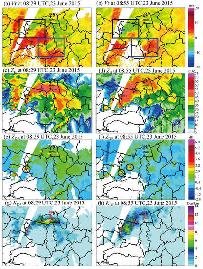 Radar plan position indicator (PPI) scan at 0.5° elevation angle: (a,b) are Vr measurements at 0829 UTC and 0855 UTC, June 2015, respectively; (c–d), (e–f), and (g–h) are ZH, ZDR, and KDP at the same time, respectively. Four gauge locations are marked with “+”. The black and blue rectangles respectively refer to the enhancing and dissipating areas of the mesocyclone, and the black circles refer to the horizontal locations of the ZDR columns.