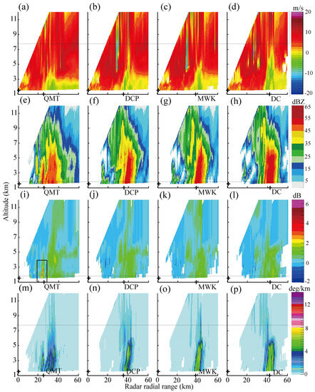 (a–d) are the vertical cross-section (VCS) of Vr along radial directions from the DMM radar to QMT, DCP, MWK, and DC at 0829 UTC, 23 June 2015. (e–h), (i–l), and (m–p) are the VCS of ZH, ZDR, KDP, respectively, at the same time. DMM radar is marked with “+” at the y-axis, and the distances of four gauge stations are marked with “+” along the x-axis. The rectangle in (i) refers to the ZDR column near the convergence line.