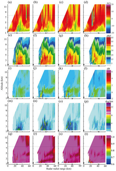 An important phenomenon accompanying the rainstorm is that big raindrops exist along the mesoscale convergence line, with large ZDR values (exceeding 2dB) near QMT on Figure 4e, and at the south of QMT and DCP on Figure 4f (marked with black circles). As depicted in the rectangle on Figure 5i and Figure 6j,k, the large ZDR columns are obviously related to the large ZH columns in Figure 5e and Figure 6f,g, which are all consistent with the convergence structures of Vr in Figure 5a and Figure 6b,c. These ZDR columns are caused by the sustaining updraft flow along the convergence line of the mesocyclone [35,36]. However, this rainstorm does not present big ZDR values within most of its parts; conversely, it is mainly composed of small ZDR values (less than 2dB), which can be seen from both the ZDR PPI scans and the VCS structures of ZDR, as illustrated by Figure 5i–l and Figure 6i–l.