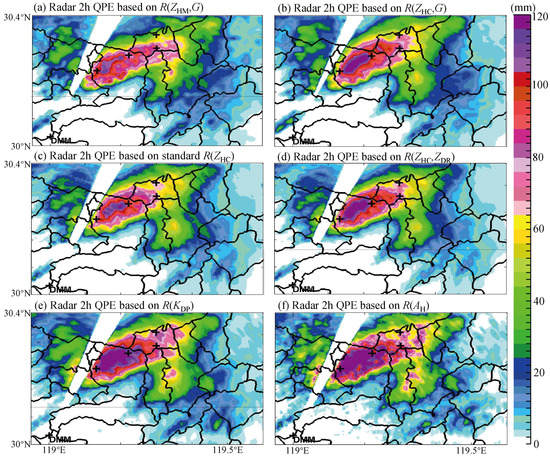 Radar 2 h rainfall accumulation fields at 1000 UTC, 23 June 2015. (a,b) are based on R(ZHM,G) and R(ZHC,G), respectively; (c–f) are based on DSD-derived R(ZH), R(ZH,ZDR), R(KDP), and R(AH), respectively.