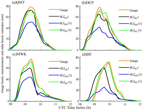 Gauge hourly rainfall measurements and corresponding radar estimates using R(ZHC), R(ZHM,G), and R(ZHC,G) at each gauge station during 08:00–12:00 UTC, 23 June 2015: (a) station QMT; (b) station DCP; (c) station MWK; and (d) station DC.