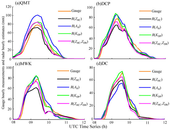 Gauge hourly rainfall measurements and corresponding radar estimates using R(ZHC), R(ZHC,ZDR), R(KDP), and R(AH) at each gauge station during from 08:00–12:00 UTC, 23 June 2015: (a) station QMT; (b) station DCP; (c) station MWK; and (d) station DC.