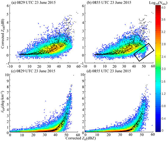 Scatter density plots of radar variables at 0829 and 0855 UTC, 23 June 2015: (a) and (b) are corrected ZDR vs. corrected ZH and (c) and (d) are KDP vs. corrected ZH. The black dots represent the simulated moments from DSD data.