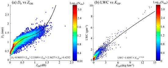 The scattergram of the median volume diameter D0 and ZDR is depicted in Figure 11a, where Equation (7) is fitted to represent the empirical relation between D0 and ZDR. Equation (7) is similar to that in Brandes et al. (2004) [37], and it works well for 0.25 dB ≤ ZDR ≤ 2 dB.