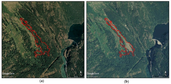 (a) 2006 Google Earth™ aerial photo used to view pre-disturbance land cover during office validation of a landscape change patch. (b) 2009 Google Earth™ aerial photo used to view post-disturbance land cover of the same patch.