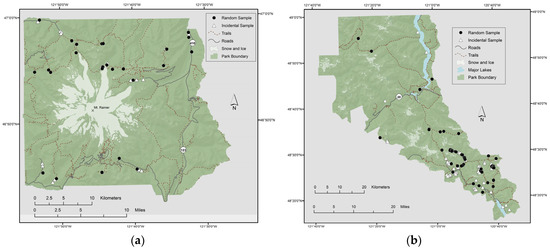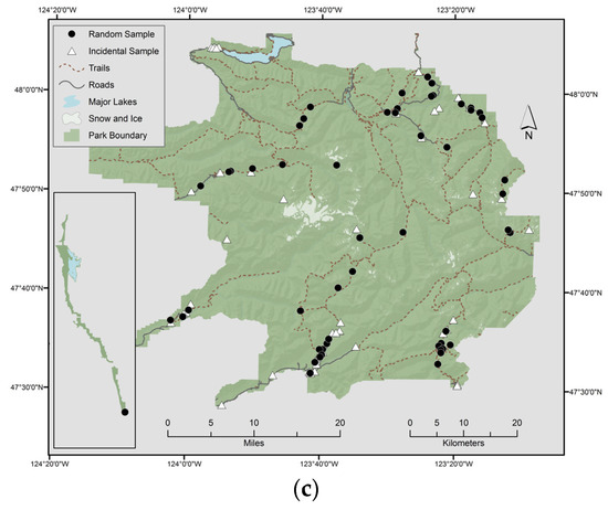 Selected landscape change patches visited at (a) Mount Rainier National Park, WA, (b) North Cascades National Park Service Complex, WA, and (c) Olympic National Park, WA. Target patches were chosen at random from patches that were up to 500 m from roads or trails. Incidental samples were encountered while accessing the random samples.