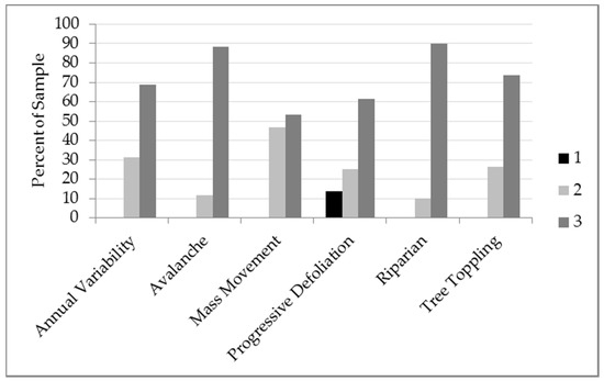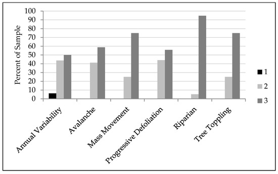 This category of disagreement includes patches where there may have been some confusion between identifying the cause and effect of landscape change being labeled. From the office view, the analyst usually only sees the effect of change: reduced canopy vigor (Progressive Defoliation), for example, or fallen trees (Tree Topple). During field sampling, however, one might be able to more readily identify the cause of change by looking at what happened under the canopy: reduced canopy vigor having been caused by a small debris flow that covered the base of trees with mud (Mass Movement); or Tree Toppling having been caused by water inundation, killing and toppling the trees (Riparian). The field calls in these cases recorded the cause of change and not the effect as it was visible to the satellite and the analyst in the office. Patches labeled as Progressive Defoliation in the office were most frequently found to have some other disturbance under the canopy. Both cause and effect were often labeled in the field using confidence of two and an alternate agent.