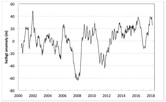 The MISR cloud heights come from the Level 2 cloud-height product (TC_STEREO version 17), which are based on retrievals at a 1.1 km horizontal resolution across a swath of width about 380 km, extending almost from pole to pole in a sun-synchronous orbit (equatorial crossing at 10:30 a.m. local time). There are 233 distinct orbital paths, broken into 180 “blocks” of length 141 km and effective width of about 380 km. The equator-crossing time of the Terra satellite changed by about 15 minutes over the first two years of the record, creating some artifacts in the results of Davies and Molloy []. These artifacts were removed in Davies et al. [], which discusses the revised sampling and analysis in detail. We used the same approach as [], but, with the longer time series we changed the baseline used for calculating the long-term means to be from March 2003 to February 2018. This baseline completely exclude the time when the equator crossing changed and is a very conservative approach, given that Davies et al. [] corrected for the changes in glitter angle. The long-term means were calculated at the path and block level, 26 times a year. That is, each region was specified by its block and path number (≈4 × 104 regions globally), and temporal changes in the annual cycle of mean cloud heights for each region were accounted for by averaging over 14-day increments (the time bins start at March 1 each year, so that the 26th bin contains one or two extra days at the end of February). The subtraction of the regional and time averages yields deseasonalized anomalies that are typically quite noisy and benefit from smoothing using a running mean. The main change from Davies et al. [] was to make this a 6-month—rather than a 12-month—running mean to give better time resolution when exploring oscillatory behavior.