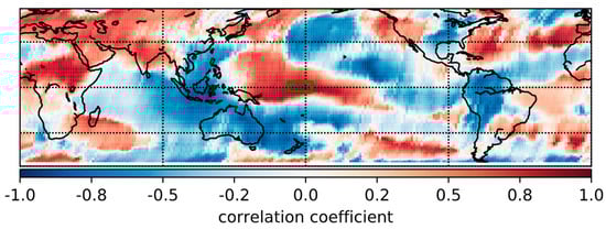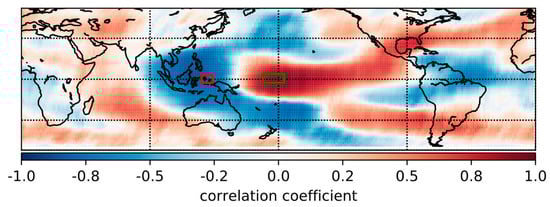 When regional height anomalies are examined [,], it is evident that the amplitudes of some regional anomalies can be far larger than anomalies in the global average, and for many regional areas, these greater amplitudes are not simply a consequence of the reduced sampling. This is especially the case along the equatorial band from 2.9°S to 2.9°N. Davies et al. [] (Figure 8) showed that the Central Pacific from 160°E to 169°W formed the largest region with coherent height anomalies, followed by the Maritime Continent from 104°E to 133°E. We examined the correlation of height anomalies from all other regions between 60°S and 60°N. To produce images that were a compromise between spatial resolution and noise, we empirically chose a 6-month running mean for each time series, defined the Central Pacific region to lie within (2.5°S–3.6°N, 169°E–176°W), and defined all other regions to be a running mean over 11 consecutive blocks and 13 consecutive paths, or approximately 14°lat by 31°lon. The correlation map for the overall time series is shown in Figure 2. In this and the subsequent two figures, the lighter colors lack statistical significance. Along the Equator this shows the classic dipole between the Central Pacific and Maritime Continent, with secondary centers of positive and negative correlation over the western Indian Ocean and the Atlantic, respectively. The Central Pacific is positively correlated eastward, with regions branching northeast across North America and extending across the Atlantic to Western Europe and North Africa, as well as southeast across the Pacific and continuing around the Southern Ocean with progressively reduced significance, perhaps as far as New Zealand. There is also a strong positive correlation with height anomalies over the Indian Ocean west of 90°E. Negative correlations peak over the Maritime Continent and branch northeast and across the Pacific to about 165°W and southeast across most of Australia to the Southern Ocean as far as 90°W. This generally agrees with the pattern noted by [] (Figure 3c), but with more data and a change in the relative frequency of positive versus negative SOI values, the average pattern is now more distinct.