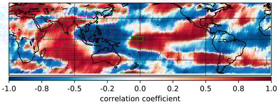 Correlations in effective height anomalies with the Central Pacific from March 2000 to May 2018. The Central Pacific region is defined by the green rectangle between 2.5°S and 3.6°N, and between 169°E and 176°W. Grid lines show latitudes (30°S, 0° and 30°N) and longitudes (90°E, 180° and 90°W). The red rectangle defines the Maritime Continent region used in Section 3.3.