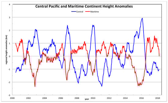 Time series of regional height anomalies over the Central Pacific and the Maritime Continent from March 2000 to May 2018, smoothed using a 6-month running mean.