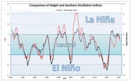 This paper also examined the oscillatory pattern between height anomalies in the Central Pacific and the Maritime Continent. As noted in Davies et al. [], these can be much larger than the global anomalies, and oscillate out of phase with each other (Figure 5). Peak amplitudes of these oscillations, after applying a 6-month smoothing, are between 2 and 3 km. The oscillations were relatively obvious over the 18-year record, defining about 10 fairly clear zero crossings when the Central Pacific and Maritime Continent height anomalies were both zero, resulting in an average separation of about 1.8 years. We have shown in Figure 9 that these zero crossings are closely related to zero crossings in the SOI and zero anomalies in the near surface zonal winds for the same regions. The difference between the height anomalies over the Central Pacific and Maritime Continents provided a robust height index, HI, that matched the Southern Oscillation Index very closely (Figure 6), but with a lag of one month. We are left with the impression that the height oscillations are a routine feature of these regions, and that, once in a while, their amplitudes are large enough to correspond to a recognizable ENSO event. HI greater than 2 km corresponds to La Niña, and less than –2 km to El Niño. The overall cycle, or periodicity, of HI is thus about 3.6 years, on average.