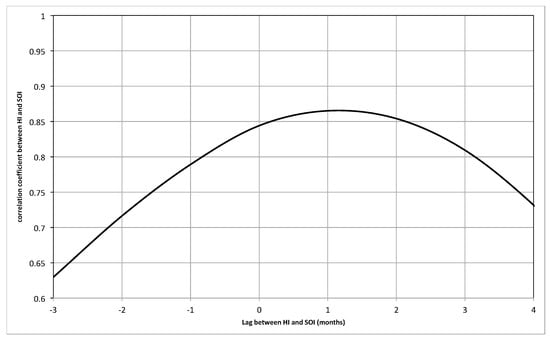 Cross-correlation between Southern Oscillation Index (SOI) and Height Index (HI) as a function of the lag. Positive lag means the HI lags the SOI.
