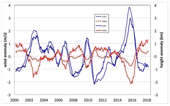 Similar to Figure 5 for height anomalies (solid lines), with zonal wind anomalies for each region added (dashed lines), both smoothed using a 12-month running mean. CP (blue) refers to Central Pacific, MC (red) refers to Maritime Continent, w (dashed) refers to the wind anomalies, h (solid) refers to the height anomalies.