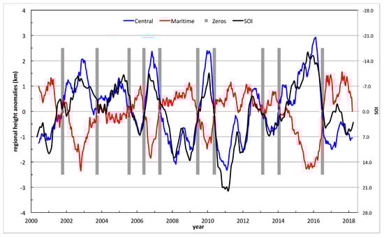 Empirically chosen zero crossings (grey) where the Maritime Continent (red) and Central Pacific (blue) height anomalies of Figure 5 are almost synchronously zero. The SOI (black) is plotted with the y-axis inverted and superimposed with a one-month lag, closely matching the Central Pacific height anomalies.