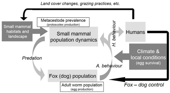 - Liccioli, S.; Giraudoux, P.; Deplazes, P.; Massolo, A. Wilderness in the “city” revisited: Different urbes shape transmission of Echinococcus multilocularis by altering predator and prey communities. Trends Parasitol. 2015, 31, 297–305. [Google Scholar] [CrossRef]