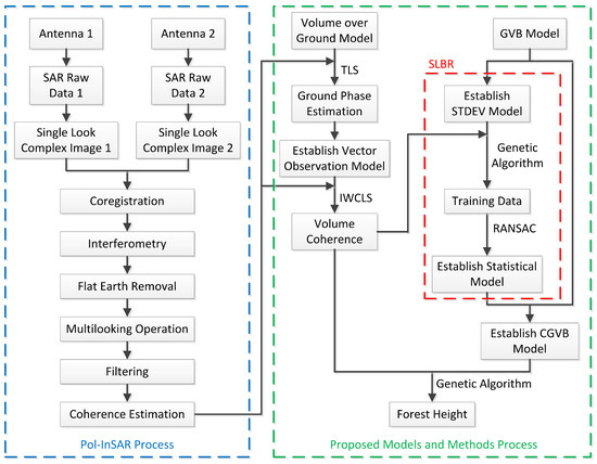The flowchart of the proposed models and methods is shown in Figure 1. The entire process is divided into two parts. The first part corresponds to the Pol-InSAR data processing consisting of radar echo imaging for two antennas, coregistration, interferometry, flat earth removal, multilooking operation, filtering and coherence estimation, as is revealed in the blue dotted line frame in Figure 1. Most importantly, the proposed models and methods, making up the second part, are the innovation of this paper, divided into three steps. Firstly, based upon volume over ground model, the ground interferometric phase is estimated using the TLS method. Next, the vector observation model is constructed, based on which volume coherence is estimated by IWCLS. Secondly, on the basis of GVB model, the STDEV model is proposed, with which the training data is obtained with genetic algorithm. Using the training data, the statistical model is then constructed and estimated with RANSAC method. Finally, CGVB model is established with the statistical model. Thereby, based on CGVB model the forest height is estimated in virtue of genetic algorithm.