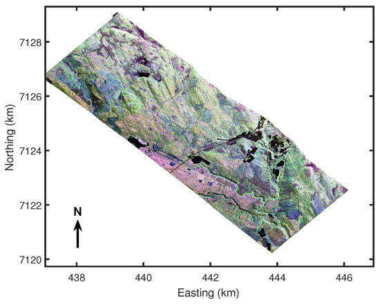The performance of the proposed CGVB model and SLBR method is evaluated with real airborne repeat-pass E-SAR P-band data. The SAR data was collected in the BIOSAR 2008 campaign by the European Space Agency (ESA) over boreal forest of the Krycklan catchment, Northern Sweden. The Pauli-basis polarimetric composite map of experimental area is shown in Figure 2. The terrain in this area ranges from about 180 to 350 m above the sea level, which can cause conspicuous errors in forest height estimation [28,29,30,31]. Therefore, forest height estimation of this data set requires terrain compensation. The forest height acquired by the lidar is used as true value to evaluate the performance of the proposed CGVB model and SLBR method. Since at least two baselines are required to solve the vector observation model in Equation (8), this paper uses a total of three interferometric pairs, as is shown in Table 1. Figure 3 shows the interferometric vertical wavenumbers which correspond to the baselines in Table 1, respectively. Note that the vertical wavenumber here is not corrected by the terrain.