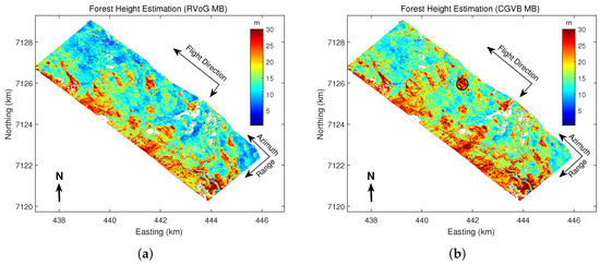 Forest height estimation with RVoG model (a) and CGVB model (b), respectively.