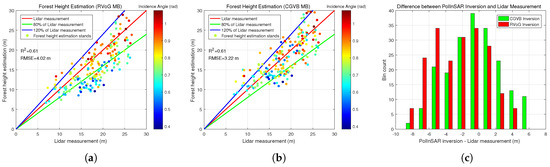 (a,b): Forest height estimation of validation stands with RVoG model (a) and CGVB model (b), compared with forest height measured by lidar. The color of the dots represents the incidence angle and scales the entire range of incidence angle in the experimental area. (c): Histogram of the difference between PolInSAR inversion and lidar measurement with RVoG model and CGVB model, respectively. The stands that are counted correspond to the stands in (a,b).