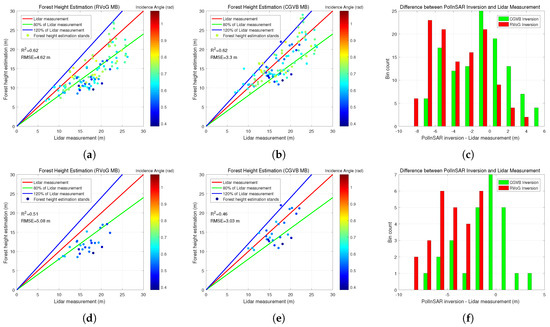 (a,b) Forest height estimation of validation stands with RVoG model (a) and CGVB model (b), compared with forest height measured by lidar. The color of the dots represents the incidence angle, scaled from the minimum of incidence angle to rad. (c) Histogram of the difference between PolInSAR inversion and lidar measurement with RVoG model and CGVB model, respectively. The stands that are counted correspond to the stands in (a,b). (d,e) Forest height estimation of validation stands with RVoG model (d) and CGVB model (e), compared with forest height measured by lidar. The color of the dots represents the incidence angle, scaled from the minimum of incidence angle to rad. (f) Histogram of the difference between PolInSAR inversion and lidar measurement with RVoG model and CGVB model, respectively. The stands that are counted correspond to the stands in (d,e).