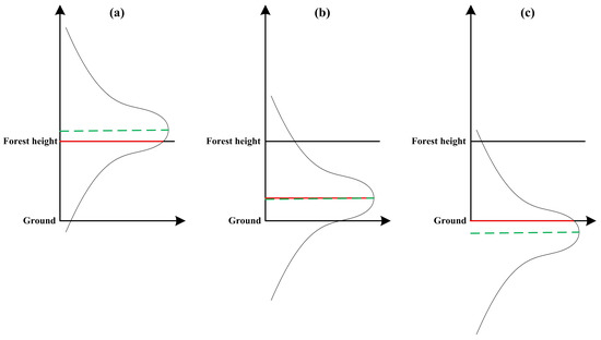 Vertical backscatter profile (VBP) corresponding to three cases: (a) The estimated strongest backscattered power elevation is higher than forest height; (b) The estimated strongest backscattered power elevation is located in canopy; (c) The estimated strongest backscattered power elevation is lower than ground. The green dashed line indicates the estimated strongest backscattered power elevation. The red solid line indicates the actual strongest backscattered power elevation.