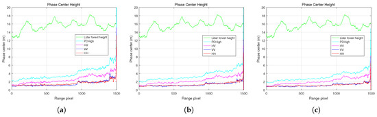 Phase center height for different polarization channels, corresponding to baseline lengths of 16 m (a), 24 m (b) and 32 m (c), respectively. The PDLow obtained by phase diversity (PD) optimization is assumed to correspond to ground scattering. The phase centers are processed by averaging along the azimuth direction.