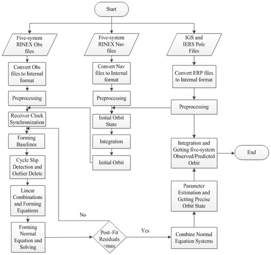 Furthermore, during the processing of the five-system ultra-rapid POD in our new prototype software platform, the length of the arc and the setting of the stochastic pulses referred to the method proposed by Simon Lutz et al. [27]. The 06 (UTC), 12 (UTC), 18 (UTC), and 24 (UTC) ultra-rapid orbits used 54-h, 60-h, 66-h, and 72-h observations, respectively. Besides this, 3–5 sets of stochastic pulses were used in each arc. The cut-off angle was set to 3 degrees, and the data sampling rate was 180 s. The available partial processing strategies are shown in Table 1, and Table 2 summarizes the observation types of each satellite navigation system selected from the observation files. In our software platform, the five-system observation and navigation files were processed simultaneously in response to MGEX’s call for the joint processing of multi-GNSS, which is also needed for the five-system ultra-rapid POD using the one-step method. In addition, the flowchart of the new prototype software platform is shown in Figure 1.