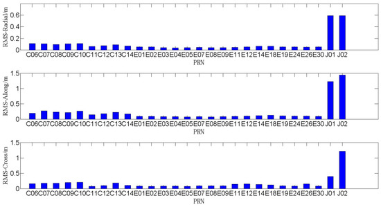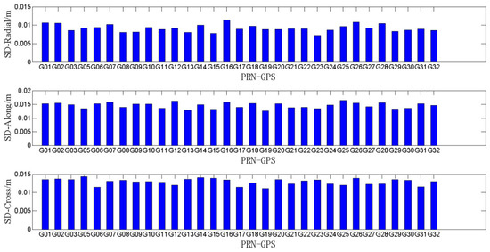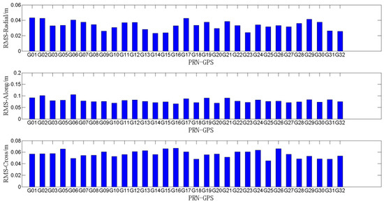 Based on the above calculations, we obtained the following test results. Figure 3 shows that the average time consumption for calculation was 2.02 h; from Figure 4, Figure 5, Figure 6 and Figure 7, compared to the final MGEX orbit products of GFZ in the radial, along-track, and cross-track directions orbit components, for the six-hour predicted orbits of GPS satellites, the average RMSs were 0.027, 0.064, and 0.052 m, respectively; for the six-hour predicted orbits of GLONASS satellites, the average RMSs were 0.033, 0.098, and 0.054 m, respectively; for the six-hour predicted orbits of BDS IGSO satellites, the average RMSs were 0.106, 0.234, and 0.184 m, respectively; for the six-hour predicted orbits of BDS MEO satellites, the average RMSs were 0.074, 0.180, and 0.114 m, respectively; for the six-hour predicted orbits of Galileo satellites, the average RMSs were 0.049, 0.093, and 0.102 m, respectively; for the six-hour predicted orbits of QZSS satellites, the average RMSs were 0.594, 1.338, and 0.804 m, respectively; from Figure 8, Figure 9, Figure 10 and Figure 11, analysis of the orbit discontinuities at day boundaries in the radial, along-track, and cross-track directions orbit components, for the six-hour predicted orbits of GPS satellites, the average SDs were 0.010, 0.015, and 0.013 m respectively; for the six-hour predicted orbits of GLONASS satellites, the average SDs were 0.014, 0.023, and 0.016 m respectively; for the six-hour predicted orbits of BDS IGSO satellites, the average SDs were 0.070, 0.108, and 0.053 m, respectively; for the six-hour predicted orbits of BDS MEO satellites, the average SDs were 0.032, 0.047, and 0.030 m, respectively; for the six-hour predicted orbits of Galileo satellites, the average SDs were 0.014, 0.020, and 0.015 m, respectively; for the six-hour predicted orbits of QZSS satellites, the average SDs were 0.241, 0.349, and 0.190 m, respectively; from Figure 12, Figure 13, Figure 14 and Figure 15, comparison between IGGAC and the final MGEX orbit products of GFZ in the radial, along-track, and cross-track directions orbit components, for the six-hour predicted orbits of GPS satellites, the average RMSs were 0.034, 0.080, and 0.056 m respectively; for the six-hour predicted orbits of GLONASS satellites, the average RMSs were 0.040, 0.113, and 0.067 m, respectively; for the six-hour predicted orbits of Galileo satellites, the average RMSs were 0.062, 0.170, and 0.090 m, respectively.