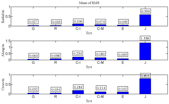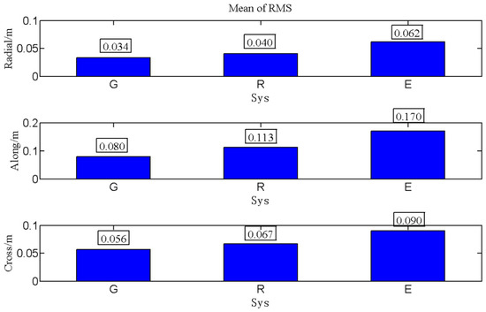 Figure 15. The mean of RMS between the six-hour predicted orbits of IGGAC and the orbits of GFZ for GPS, GLONASS, and Galieo.