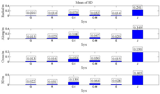 Figure 11. The mean of SD for five systems (I = IGSO, M = MEO, 3D = three dimension). - The Institute of Geodesy and Geophysics (IGG), as one of the iGMAS ACs, has provided ultra-rapid orbits estimated by the two-step method [51]; therefore, the six-hour predicted part of each arc for these orbits (named IGGAC in this paper) were compared to the final MGEX orbits of GFZ in the radial, along-track, and cross-track directions orbit components. In this test period, the available ultra-rapid orbits of IGGAC included satellites of GPS and GLONASS from 1 January 2018 to 31 January 2018, and of Galileo from 14 January 2018 to 31 January 2018. Figure A11, Figure A12 and Figure A13 of Appendix A represent the differences between the predicted orbits of IGGAC and the orbits of GFZ for GPS, GLONASS, and Galileo satellites. Figure 12, Figure 13, Figure 14 and Figure 15 represent the root mean square (RMS) of these satellites. Table A1 of Appendix A shows the differences between the results of our new prototype software platform and IGGAC in consistency with the final MGEX orbit products of GFZ.