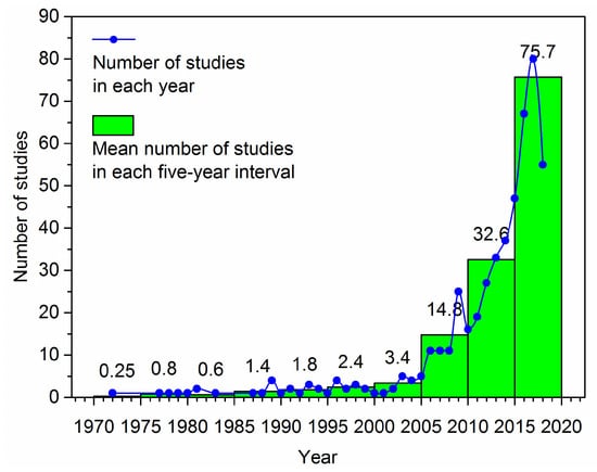 Number of studies in each year and the mean number of publications in each five-year interval. Note that the final year (2018) has data only for eight months (January–August).