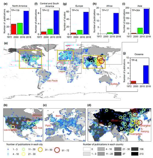 Geographic distribution of the selected SUHI literature based on the study location. (a) The number of studies per city (empty cycle) and country (background color), (b–d) the enlarged view of the SUHI publications in North America, Europe, and Asia, and (e–j) the number of publications in each continent. One study may cover a series of cities distributed in different countries and/or continents. Two global-scale studies [,] were not included in this summary since they did not specify the studied cities. Three regional-scale studies [,,] were not counted in the number of publications in each city (panels a to d) because they focused on the SUHIs of all cities in spite of city size. TP represents the total publications in each continent.