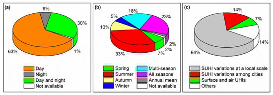 The study time of day (a), season (b), and foci (c) of the selected SUHI studies.