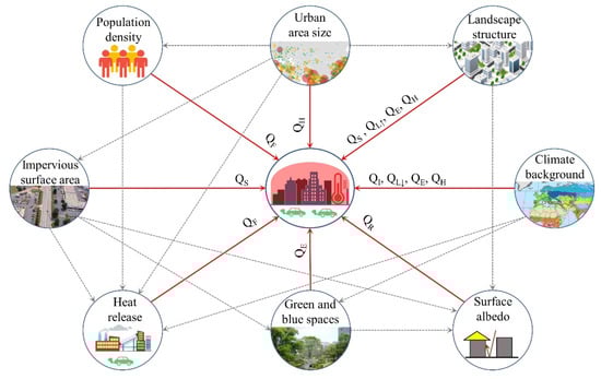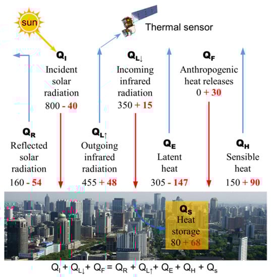 The SUHI is essentially caused by alterations of the surface energy balance after replacing natural land with an artificial surface [,,]. The energy balance of a typical urban surface can be expressed as: incident solar radiation (QI) + incoming longwave radiation (QL↓) + anthropogenic heat releases (QF) = reflected solar radiation (QR) + outgoing longwave radiation (QL↑) + latent heat (QE) + sensible heat (QH) + heat storage (QS) (Figure 4). Satellite thermal sensors measure LST indirectly by detecting QL↑ from the Earth surface []. The urban-induced SUHI, which represents an increase in QL↑, and, in general, is dominated by different energy fluxes during the day and night [,,]. The daytime SUHI is widely attributed to a reduction in reflected solar radiation and latent heat flux, which increases the sensible heat and upwelling thermal radiation received by thermal sensors []. In contrast, the nighttime SUHI was mainly contributed by the larger storage heat during the day for a later release at night [,]. The anthropogenic heat flux, as an urban-specific energy input, could increase the SUHI independent of the time-of-day by magnifying the upward thermal radiation and the heat storage []. Factors impacting any energy component of urban surface can influence the daytime and/or nighttime SUHI intensity and even convert the urban area from a source to a sink of heat.