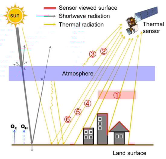 Remotely-sensed LST is completely different from air temperature in terms of observation principles and altitudes, which makes SUHI not directly comparable to air UHI []. Thermal sensors measure surface temperature indirectly by detecting upward long-wave radiation from the Earth surface at a narrow solid angle of view (Figure 6). Thermodynamic and radiative properties, including surface energy input from the atmosphere and sun, surface moisture, and thermal admittance, surface emissivity, near-surface atmospheric conditions, and surface turbulent transfer can seriously affect the upwelling surface radiation []. The radiances received by remote sensors are further influenced by the sensor-viewing angle []. A large fraction of the urban surface may not be viewed by sensors because of the three-dimensional nature of the urban structure obscuring some of the surface from view, and the atmosphere may absorb a significant portion of the radiation []. At the same time, some atmospheric radiation may be received by sensors directly without interacting with the Earth surface or the target objects (Figure 6). The accuracy of LST estimates, therefore, depends strongly on corrections for atmospheric effects and an accurate estimate of surface emissivity [,,,]. These two, however, are often difficult to assess given large areas covered by remotely sensed imagery and the lack of detailed atmospheric parameters at the time of satellite overpass []. For example, surface emissivity was usually assumed to be the same across a heterogeneous urban area []. Furthermore, the interpretation of satellite-derived LST data is hampered because urban pixels are generally not homogeneous and isothermal. They usually include several active surfaces that have different thermodynamic and radiative properties and, thus, different temperatures. In addition to the internal errors of sensors and cosmic background noise, the pixel-based LST estimate is an ambiguous quantity found by inverting Planck’s law.