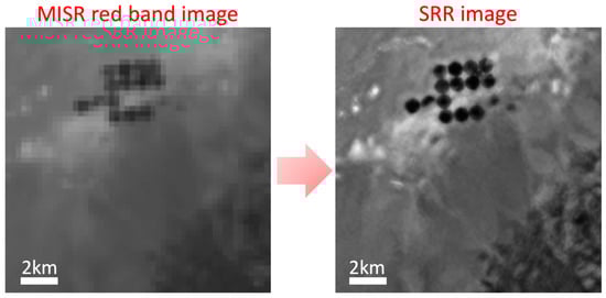 An example of the 275 m Multi-angle Imaging SpectroRadiometer (MISR) red band image (left) super-resolved to 68.75 m super-resolution restoration (SRR) image (right).