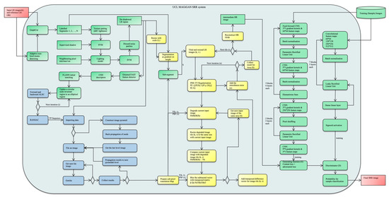 Detailed flowchart of the University College London (UCL) MAGiGAN SRR system (full resolution figure is included in the Supplementary Materials). The two red boxes stand for the input low-resolution (LR) images and final output SRR image, respectively. The green boxes are the new developments within the CEOI SuperRes-EO project. The yellow and blue boxes are components from the original gotcha partial differential equation based total variation (GPT) SRR system. Both the green and yellow boxes are ported onto a graphics processing unit (GPU). The blue boxes for the Gotcha process remain running on the multi-core central processing units (CPUs).