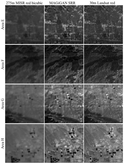 The first test site Railroad Valley is an EO vicarious calibration test site with large homogenous regions located at (38.5°, −115.69°) in the state of Nevada, U.S. In this work, we take cropped 275 m MISR red band L1B1 images with 8 off-nadir viewing angles (P040_O044742_DF/CF/BF/AF/AA/BA/CA/DA_F03_0024) and 1 red band L1B2 reference image (P040_O044742_AN_F03_0024), taken on 16 May 2008, as inputs to produce output SRR image at 4× scaled grid (68.75 m) with an effective resolution of about 3×. The 30 m Landsat 7 red band image (LE07_L1TP_040033_20080516_20160923_01_T1_B3), taken on the 16 May 2008, is used for comparison with the SRR result. A comparison of the UCL MAGiGAN SRR results at Railroad Valley in comparison with the original 275 m MISR red band image and 30 m Landsat red band image for 4 different areas are shown in Figure 3.