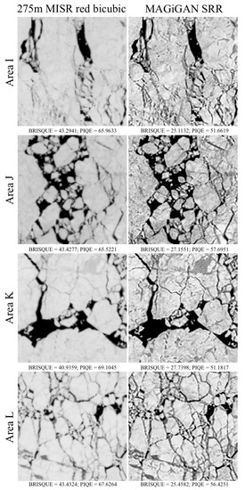 At the third test site, we picked a sea ice field located at (76.9°, −142.6°). In this work, we took cropped 275 m MISR red band L1B1 images with 8 off-nadir viewing angles (P080_O039735_DF/CF/BF/AF/AA/BA/CA/DA_F03_0024) and 1 red band L1B2 reference image (P080_O039735_AN_ F03_0024), taken on the 7 June 2007, as inputs to produce output SRR image at 4× scaled grid (68.75 m) with effective resolution of about 2.75×. There is no Landsat image available of that area for evaluation. A comparison of the UCL MAGiGAN SRR results for the sea ice field in comparison with the original 275 m MISR red band image for 4 different areas are shown in Figure 5, the corresponding BRISQUE and PIQE scores are given below each image. The SRR image contains more structural details and sharper edges compared to the bicubic interpolated MISR image. The SRR image achieved good overall scores for both BRISQUE and PIQE for all 4 areas (I, J, K, L) of the third testing site at the sea ice field. In particular, leads and meltwater ponds can be observed in the MISR SRR which are difficult to detect in the original MISR scene.