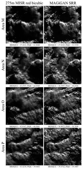 At the last test site, we picked a cloud field located using the same MISR orbit (P080_O039735_F03_0024) captured on the 7 June 2007. The output SRR image is 4× scaled grid (68.75 m) with an effective resolution of about 2.75×. There is no Landsat image available around the same time for evaluation. A comparison of the UCL MAGiGAN SRR results for the cloud field in comparison with the original 275 m MISR red band image for 4 different areas are shown in Figure 6, the corresponding BRISQUE and PIQE scores are given below each image. The SRR image contains more structural and texture details compared to the bicubic interpolated MISR image. The SRR image achieved much better scores for both BRISQUE and PIQE compared to the bicubic interpolated MISR image for all 4 areas (M, N, O, P) of the fourth testing site at the clouds field.