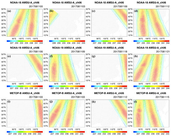 The coverages of AMSU-A channel 6 from satellites NOAA-18 (a–d), NOAA-19 (e–h), and METOP-B (i,j,k and l) used in RMAPS on 11 August 2017, at different times. Different colors denote the brightness temperatures (K) from the satellite radiance observations.